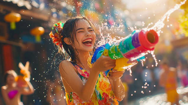 しかし、現代のソンクラーンでは、町中の人々が水鉄砲やバケツを使って水をかけ合い、非常に賑やかな雰囲気になります。